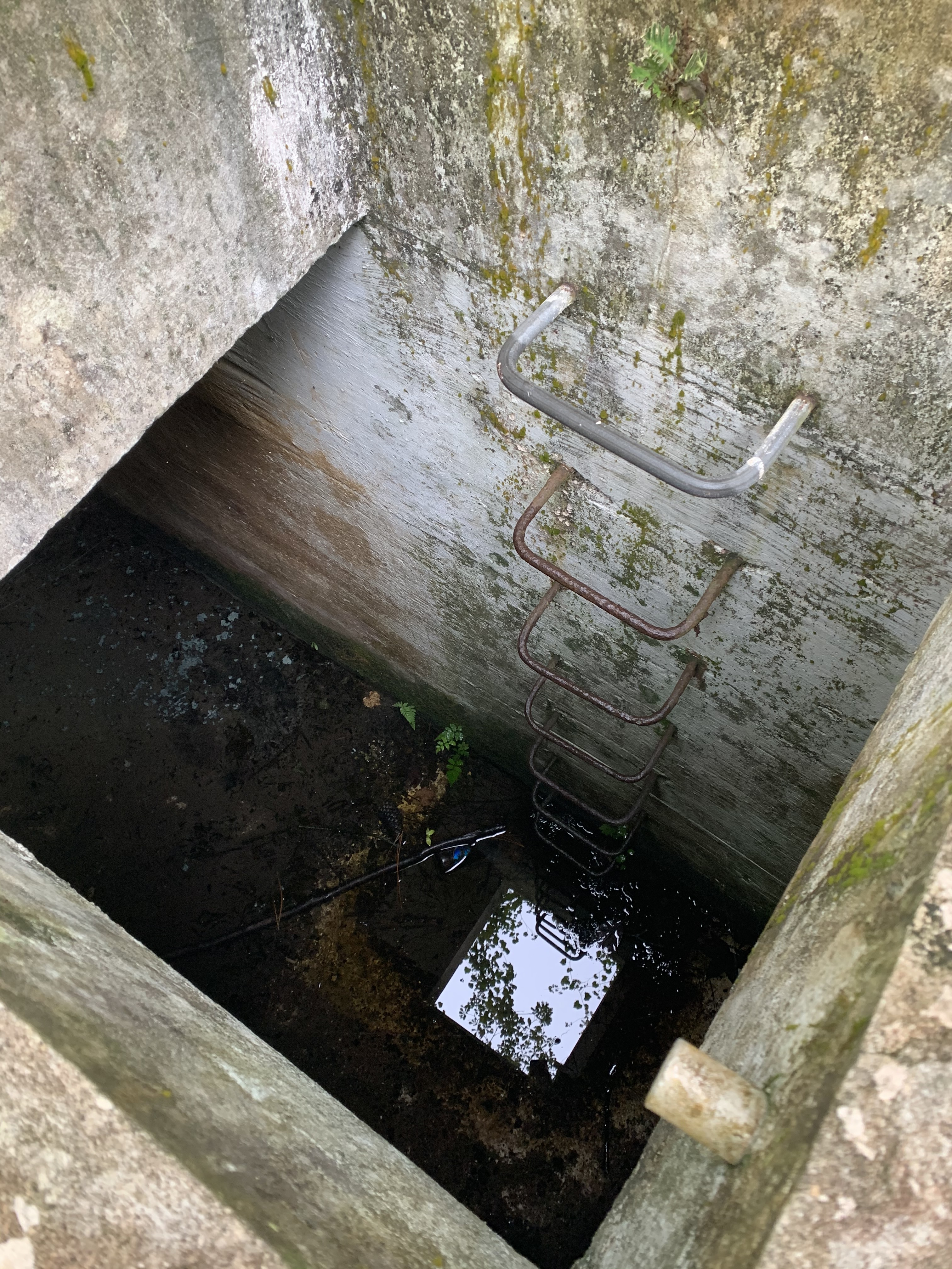 Road 77 is one of several dirt roads which cuts across the main path and leads back to County Road 315. Less than a mile from 315 is a bunker hidden about twenty-five yards into the woods. If you don’t know what you’re looking for, there is no way to find it, but those who have come across of it spread the word about the odd structure and tell stories of something evil that may live there. The bunker itself has no history to it. Unlike some of the other shelters seen in other parts of the forest, this one is small and not connected to bombing locations or military maneuvers. It is, however, made of thick concrete like the others, but unlike its possible brothers, it looms in a random location and is over seven feet high but only about ten feet long. If you can climb the moss-covered cement to the top, you find the entire structure is closed with a hole, sticking out like a chimney, which obviously used to have a cover. Take a rusty set to stairs and you’ll be another seven feet under the ground, knee deep in murky water and staring into complete darkness.